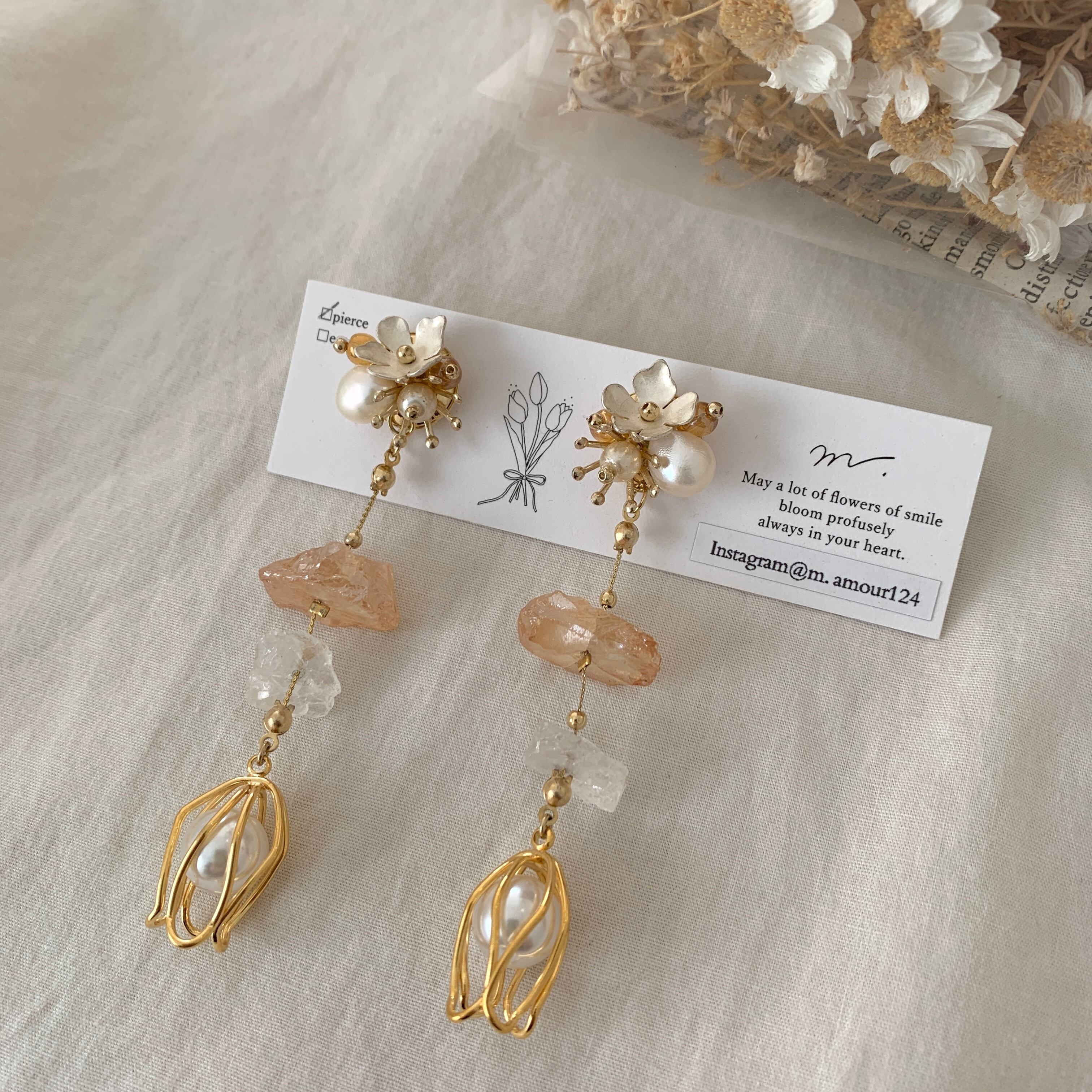 淡水パール×オレンジクリスタル チューリップ ピアス 116