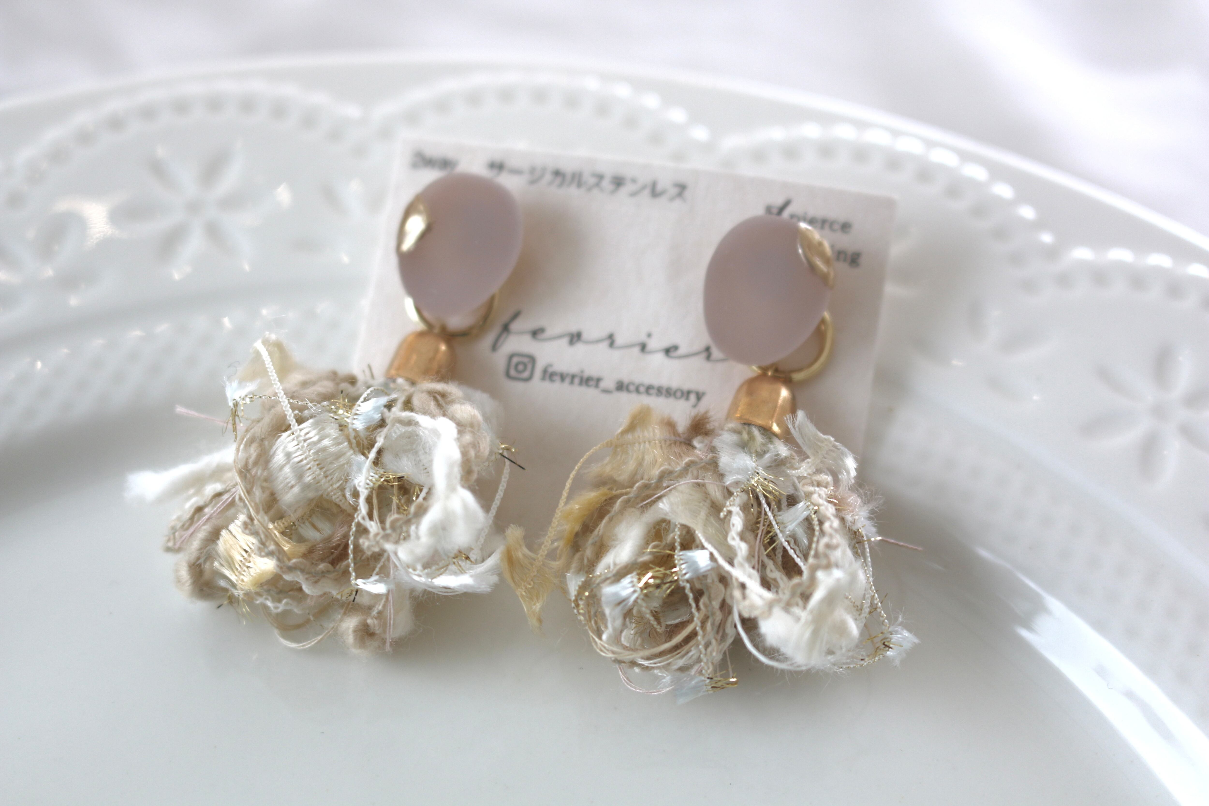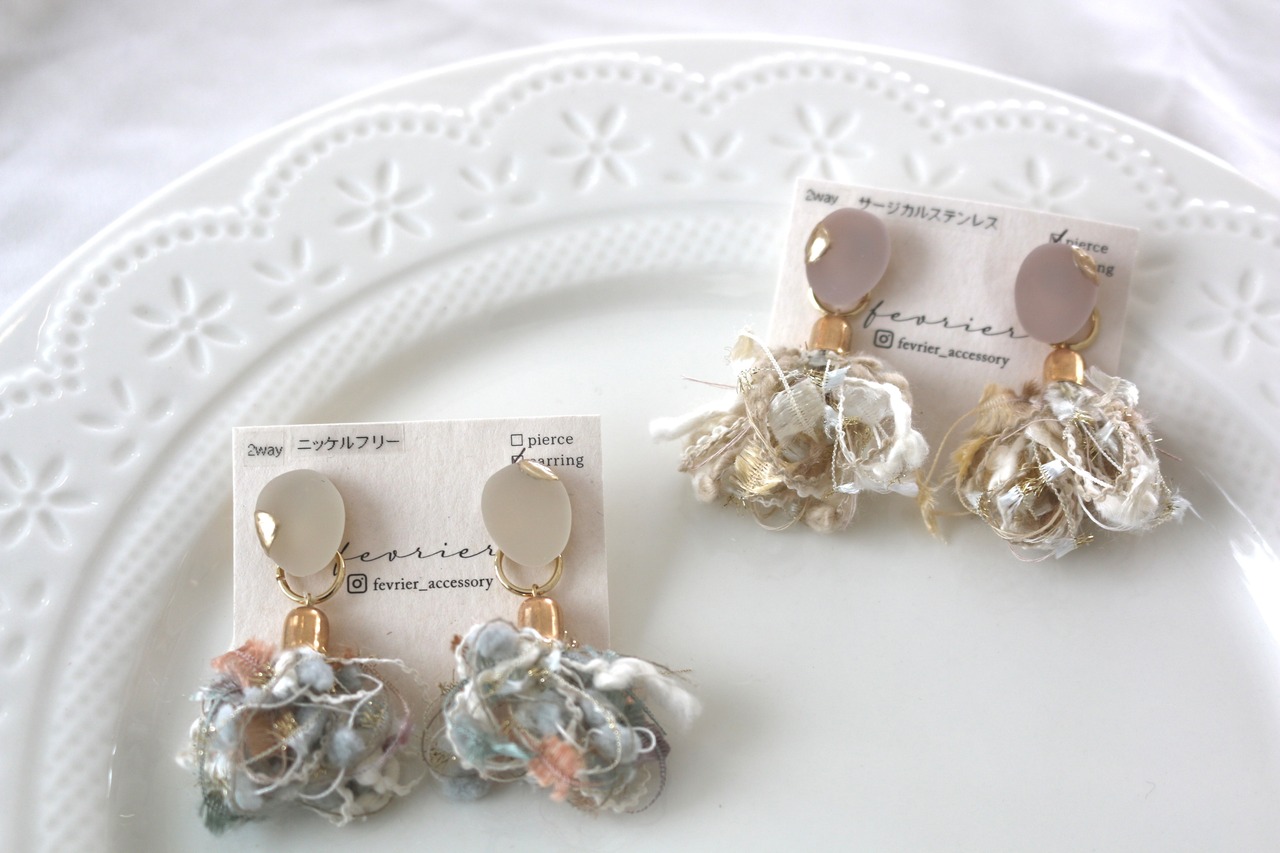 2way アシメカボション×ふわふわタッセル ピアス 14